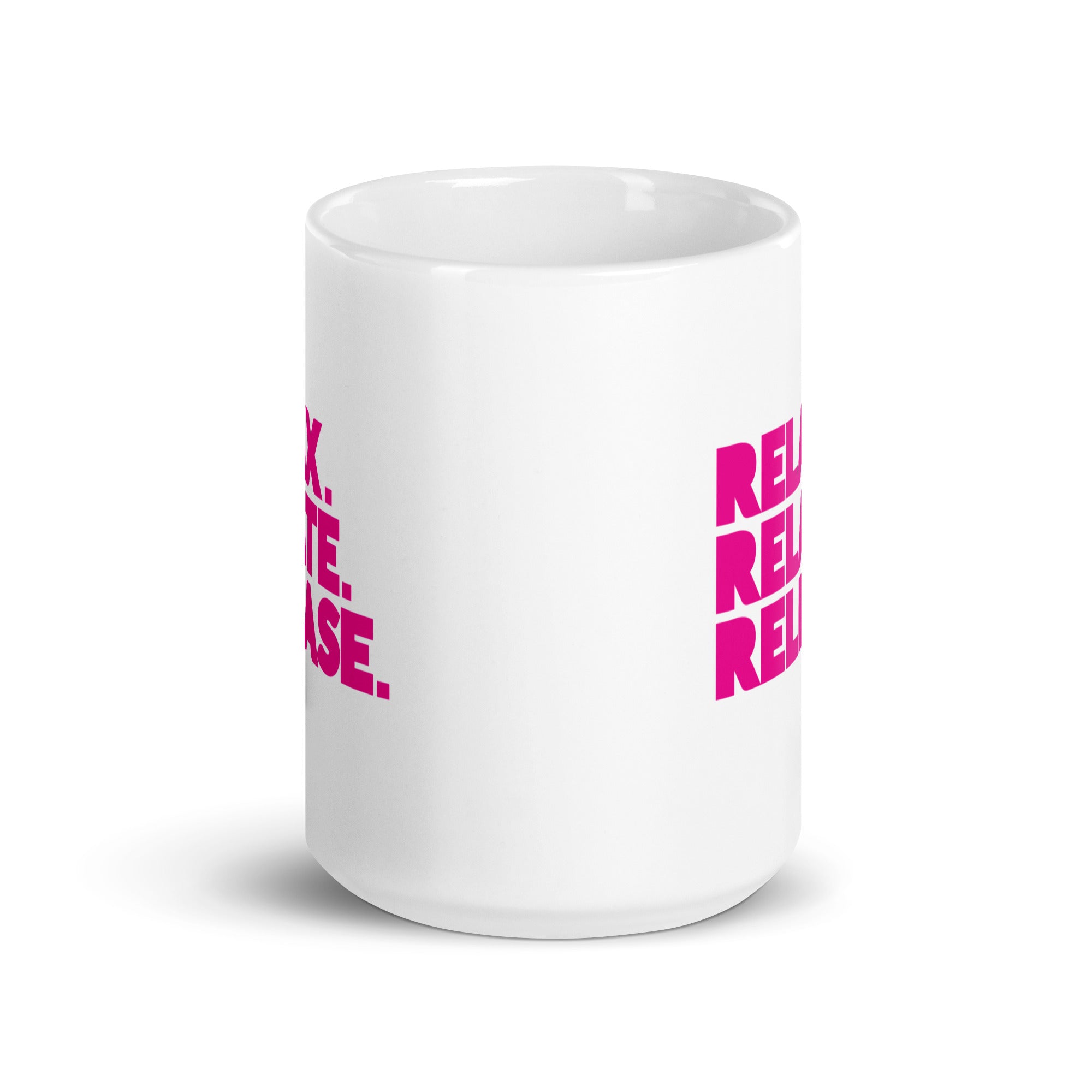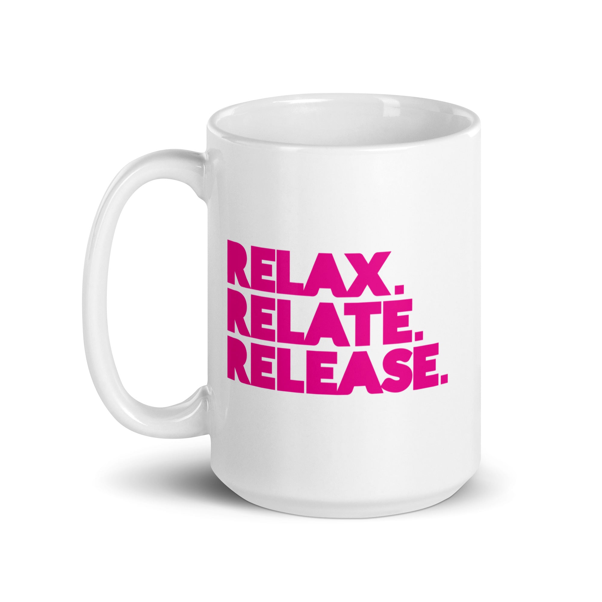 Relax. Relate. Release. White Glossy Mug